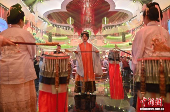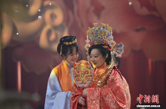 1月9日,吉林長春,任鴻洋(右)手持熏香入場。長春“00后”女孩任鴻洋是一位漢服愛好者,出于對傳統(tǒng)文化的熱愛,她成為一名執(zhí)禮喜娘。她已為50多對新人舉辦中式婚禮,通過優(yōu)雅的古典儀式,不僅推廣傳統(tǒng)婚俗,更致力于傳播漢服文化。她希望以年輕的方式,讓千年“中式浪漫”在現(xiàn)代生活中煥發(fā)新光彩。中新社記者 張瑤 攝